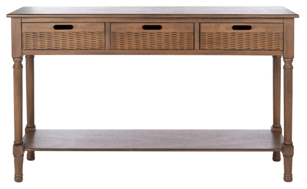A good place to start in your entryway when gathering items is with an entry table. This is an anchor piece for the space, and you can build from there. I found this beautiful Dupuis 47.25″ Console Table for $219.99 on Wayfair’s website. It has unique basket weave style drawers and a really clean design.