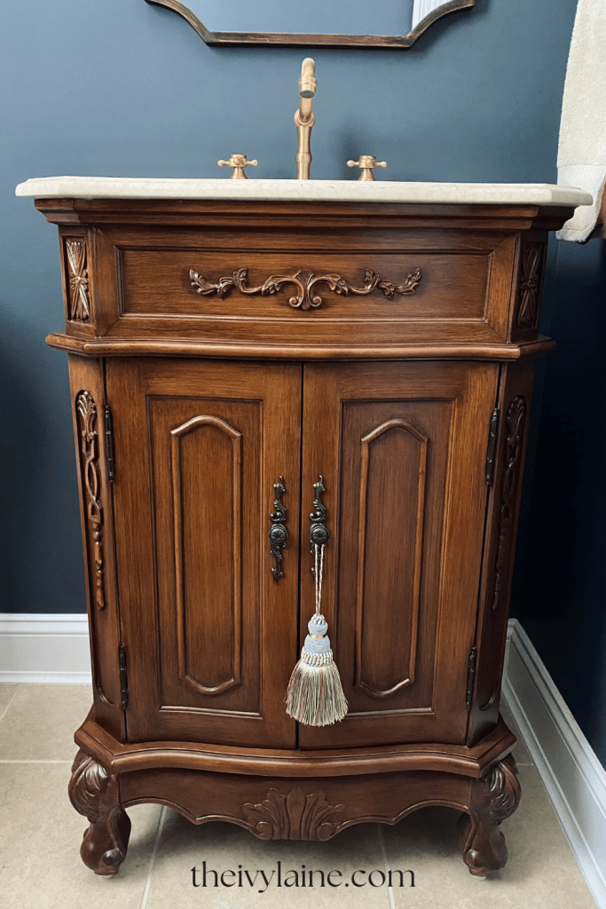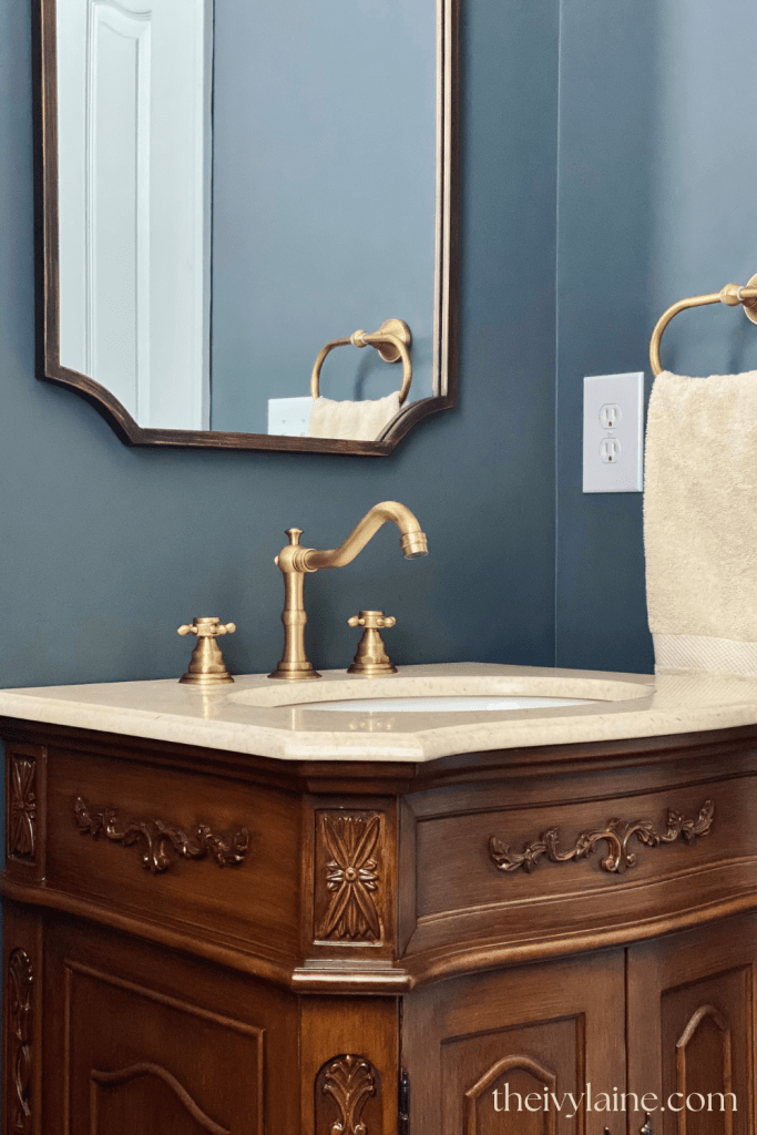 I spent a lot of time looking at vanities before landing on this gorgeous wood vanity with marble top. I knew I wanted something petite for this smaller space, and I wanted details. This vanity is small but heavy, and I like the ornate detailing it brings to the room. You can find it here. It is currently listed at 42% off making it $599.99.