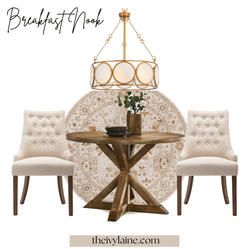 The 4 elements I would start with in any breakfast nook? Area rug, table, chairs, chandelier. To me, these are the bones of the space. You can always add in more decorative items as time goes on, but by starting with these you have the basic things you need and a really great foundation to build on.